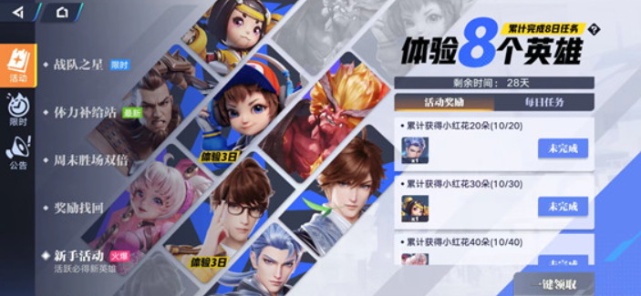 對戰(zhàn)生涯和活動就非常簡單了,對戰(zhàn)生涯算得上是系統(tǒng),給玩家們白嫖的英雄只要玩家成功完成規(guī)定戰(zhàn)斗局數(shù)就可以在這當中領(lǐng)取英雄?;顒訉τ谛率滞婕襾碚f會更加的友好,新手玩家可以根據(jù)每天不同的任務(wù),獲取不同英雄的體驗卡。