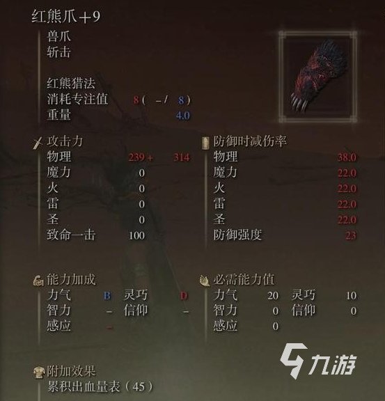 紅熊爪的攻擊力不容小覷,物理攻擊力高達(dá)104,足以讓敵人在瞬間受到重創(chuàng)。而在防御方面,它也有著不俗的表現(xiàn),物理減傷率高達(dá)38,能夠有效地抵御敵人的物理攻擊。此外,紅熊爪對(duì)魔力、火、雷、圣等屬性的減傷率也達(dá)到了22,這使得它在面對(duì)各種敵人時(shí)都能保持較高的生存能力。
