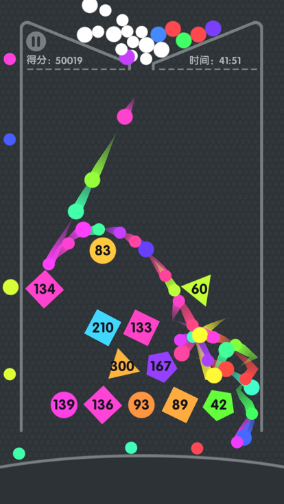《跳舞的彈珠》游戲運(yùn)用了炫目奪睛的熒光效果,針對屏幕進(jìn)行了異彩紛呈的渲染,而且運(yùn)用了方塊奇妙絕倫的,構(gòu)建出了回環(huán)曲折的迷宮地圖,玩家將從迷宮入口操縱彈珠進(jìn)行蓄力打擊,在方塊墻之間循環(huán)往復(fù)的進(jìn)行彈跳,除此之外,游戲又將彈珠新穎別致的與貪吃蛇、泡泡龍等游戲進(jìn)行了聯(lián)動,開創(chuàng)出了玩法性更為一反常態(tài)的游戲。