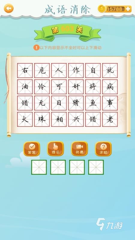 這款游戲中,比較考驗大家對于成語的認知,是一款和成語有關(guān)的載體,闖關(guān)游戲,對玩家們提供了許多的成語,其中包含了很多的錯別字,需要大家來進行判斷,游戲的玩法與其他答題的玩法都不相同,玩家們可以體驗到更有趣的內(nèi)容,同時還可以考驗大家的眼力,以及對于成語的理解,相關(guān)的成語知識,并不是特別的復雜,關(guān)卡還是非常豐富的。