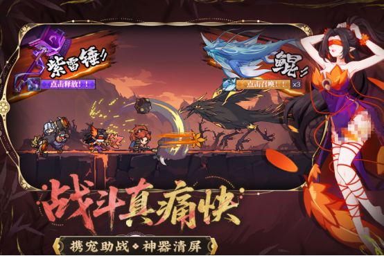 以山海經(jīng)為題材,共同游歷山海世界,共同對(duì)戰(zhàn)八荒神獸,將三消以及即時(shí)戰(zhàn)斗結(jié)合,可釋放英雄的能力,與眾多異獸展開(kāi)超大規(guī)模激情戰(zhàn)斗。游戲在養(yǎng)成角色的過(guò)程中,幾乎沒(méi)有門(mén)檻兒,也沒(méi)有任務(wù),而且每天完成任務(wù)之后,都有機(jī)會(huì)獲得星元角色,每天都會(huì)實(shí)時(shí)重置。將在充滿(mǎn)奇幻特色的山海經(jīng)世界,享受痛快的大規(guī)模戰(zhàn)斗,獲得滿(mǎn)屏清怪的爽快感。