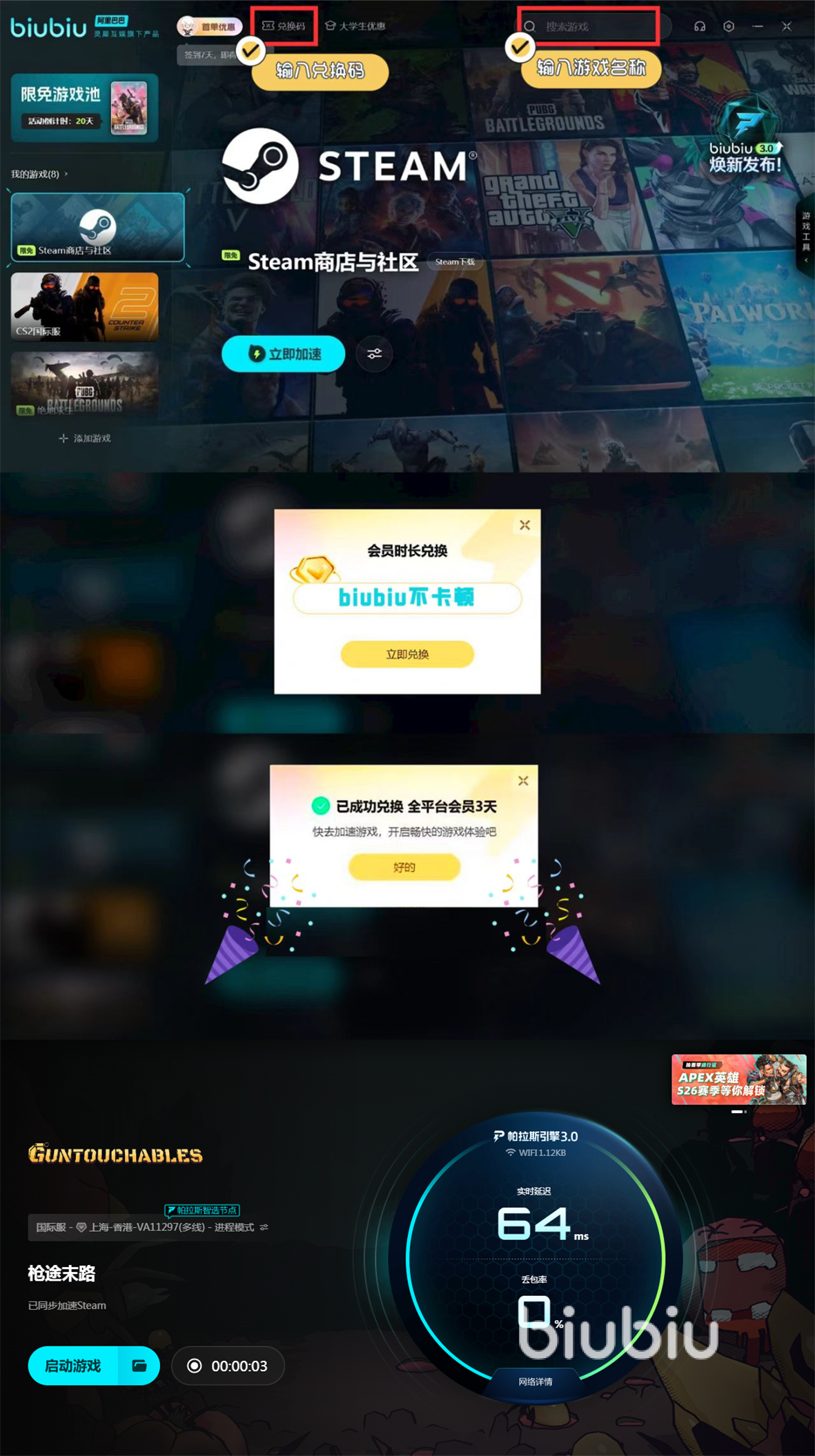 在完成了游戲領取和下載之后,如果想要順利運行,那么還需要biubiu加速器的幫助。這款加速器軟件能夠幫助大家應對很多網絡問題,現在的biubiu進行了重磅更新,采用了帕拉斯引擎3.0技術,性能更加優(yōu)異,而且還邀請了知名冠軍選手Aixleft合力打造,解決了在之前加速過程中的很多痛點問題,已經達到了電競級別,非常適合大家選擇。新用戶現在只需要注冊一個新biubiu賬號,就能立得24小時會員加速時間,所以新人可大膽放心的加入進來。還有一項重磅福利是每個號都能使用兌換碼【biubiu不卡頓】,得到三天會員時間。