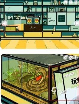 走到這堵墻上。點擊這只盒子,就會看見綠色的小蛇。這條蛇,好像包裹著什么,卻無法捕捉。只要看一眼【玩蛇】,就能判斷出這條蛇的喜好,然后選擇【檸檬】、【橘子】,點開【橙子】,進入。