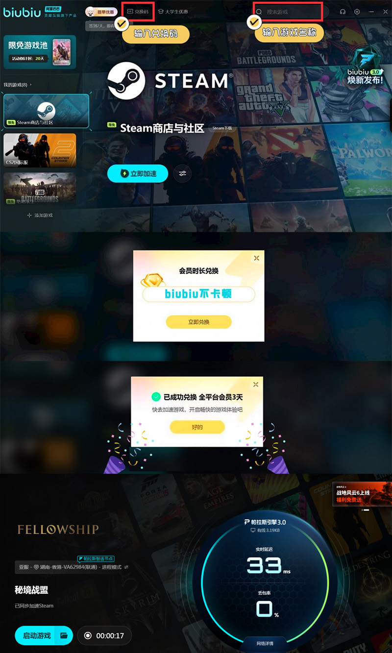 作為一款熱門(mén)加速工具,biubiu提供免費(fèi)試用的機(jī)會(huì),新用戶能免費(fèi)試用一天,還能通過(guò)兌換碼【biubiu不卡頓】領(lǐng)取3天加速時(shí)間。同時(shí),biubiu加速器重磅升級(jí),同冠軍選手Aixleft優(yōu)化軟件設(shè)計(jì),引入帕拉斯引擎3.0,帶來(lái)更高效加速效果。