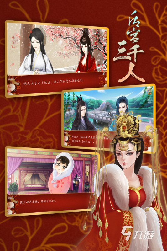 《后宮三千人》是一款高自由度的古代宮廷換裝游戲,服裝色彩各異,多姿多彩的形象讓人魂牽夢繞,這里你將享受最高待遇的后宮生活,滿足了作為皇帝的一切美好幻想,與各種風格的嬪妃女子度過一個個浪漫的愛情故事,有的溫柔賢惠,可愛動人,有的性格火辣颯爽酷帥,也有楚楚動人的憐惜弱女子形象,根據(jù)你的喜好選擇,還可以為他們購買其他精美的服裝。