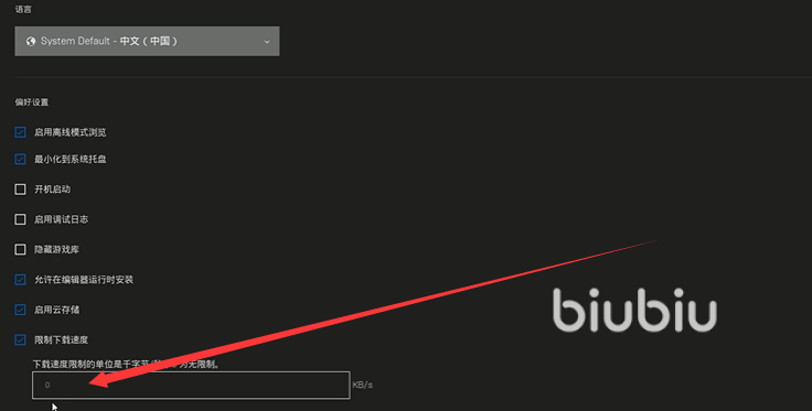 接下來,我們再來解決下載速度的問題。打開Epic啟動器的設(shè)置選項。在其中找到“限制下載速度”的選項并勾選,然后將速度設(shè)置為連續(xù)的999(這只是一個象征性的數(shù)字,實際設(shè)置中會自動調(diào)整為最大值,其實是無需過多的關(guān)注具體數(shù)字的),直接返回上一級菜單,退出啟動器,并以管理員身份重新運行它即可。再次嘗試下載一個游戲,會發(fā)現(xiàn)下載速度如同脫韁的野馬,飛快無比了。