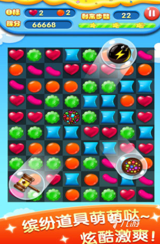 一款極具趣味性的益智消除游戲,游戲內(nèi)含大量關(guān)卡,每一關(guān)都有著獨(dú)特的過(guò)關(guān)條件,為玩家?guī)?lái)多變的游戲體驗(yàn)。此外,游戲中還提供了多種功能各異的道具供玩家選擇使用,巧妙地運(yùn)用這些道具能讓游戲進(jìn)程變得更加順暢愉快。游戲中包含六種基本色糖果及五種特殊糖果作為消除對(duì)象,目標(biāo)比較多樣,讓玩家在輕松的操作中沉浸于絢爛的糖果奇境。
