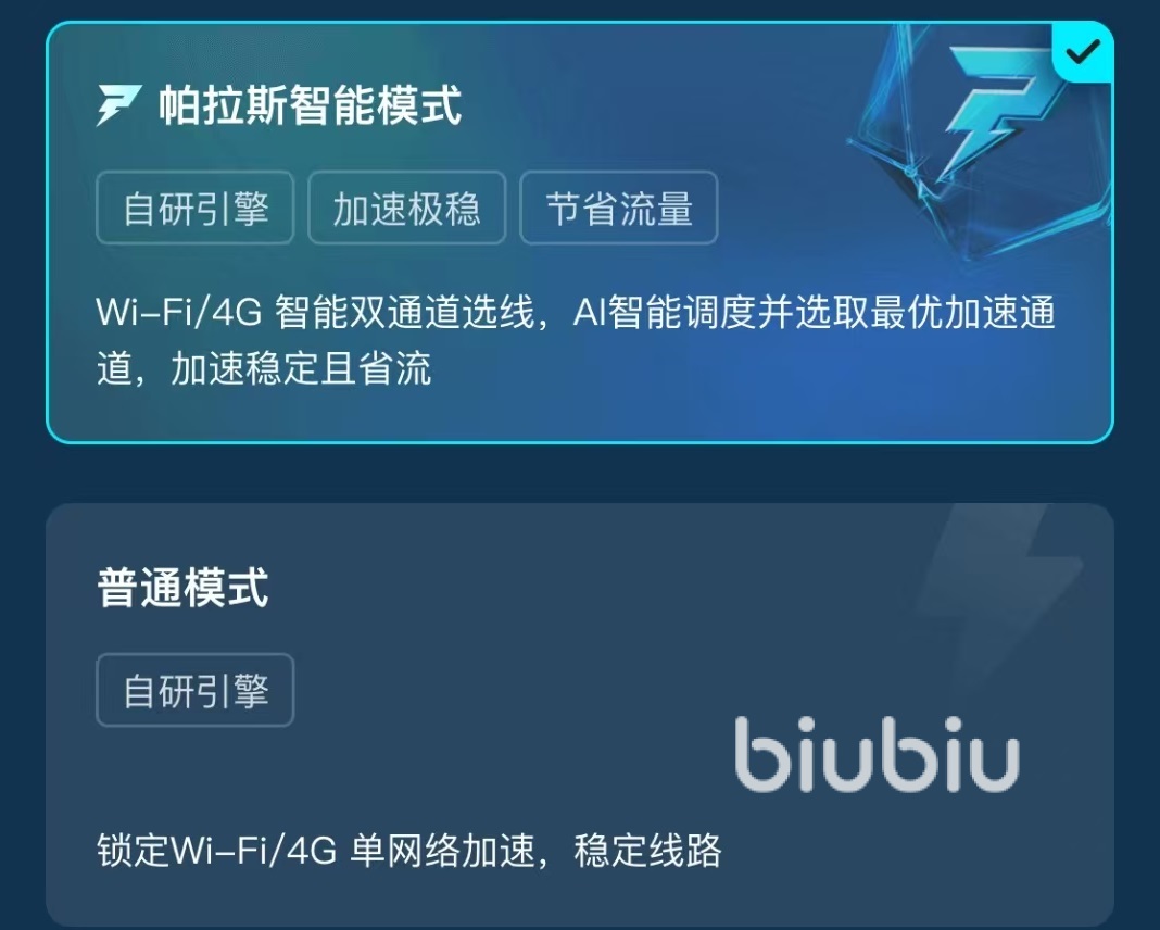 大家在移動(dòng)端進(jìn)行加速的時(shí)候,使用的是自主研發(fā)出來(lái)的帕拉斯引擎2.0,該引擎非常智能,不僅集成了高速專(zhuān)網(wǎng),多路發(fā)包等一系列科技。而且還分為兩個(gè)不同模式,其中最推薦的當(dāng)然是帕拉斯智能模式,將該引擎的功能真正發(fā)揮出來(lái),帶來(lái)加速極穩(wěn)特點(diǎn),還能節(jié)省流量。采用WiFi和4g雙通道線(xiàn)路選擇技術(shù),利用人工智能來(lái)進(jìn)行調(diào)度,選取最優(yōu)加速通道,使得加速過(guò)程極其穩(wěn)定。當(dāng)然普通模式也是自主研發(fā)出來(lái)的引擎,特點(diǎn)是會(huì)鎖定單一網(wǎng)絡(luò),在效果方面比智能模式要稍差一些,大家根據(jù)實(shí)際情況去選擇就可以了。