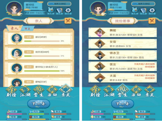 相對于擁有著很多人物以及豐富故事劇情的,這款屬于文字模式,依舊能進入武俠題材,只不過每個人都可有著不一樣的武俠人生,出生以后每一年做的事情,大家都可進行自由的選擇,包括拜師學(xué)藝,或者是選擇各種各樣的行業(yè)。比如武俠世界當(dāng)中的錦衣衛(wèi),甚至是捕快,都可以成為自己所擁有的職業(yè),玩起來比較有趣。