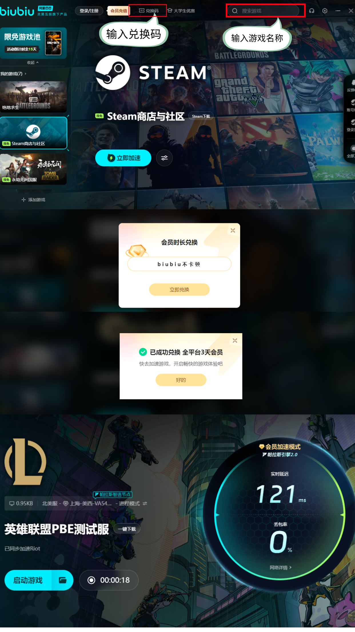 上方小編給大家推薦的加速應(yīng)用十分好用,而且新用戶登錄還可享受超多福利,比如注冊(cè)成功會(huì)有24小時(shí)的免費(fèi)提速福利可以獲取。此外,平臺(tái)還額外給大家提供了三天的體驗(yàn)時(shí)間,小伙伴們可以根據(jù)自己游玩的時(shí)間自行兌換,在軟件首頁(yè)的左上角區(qū)域輸入【biubiu不卡頓】即可。