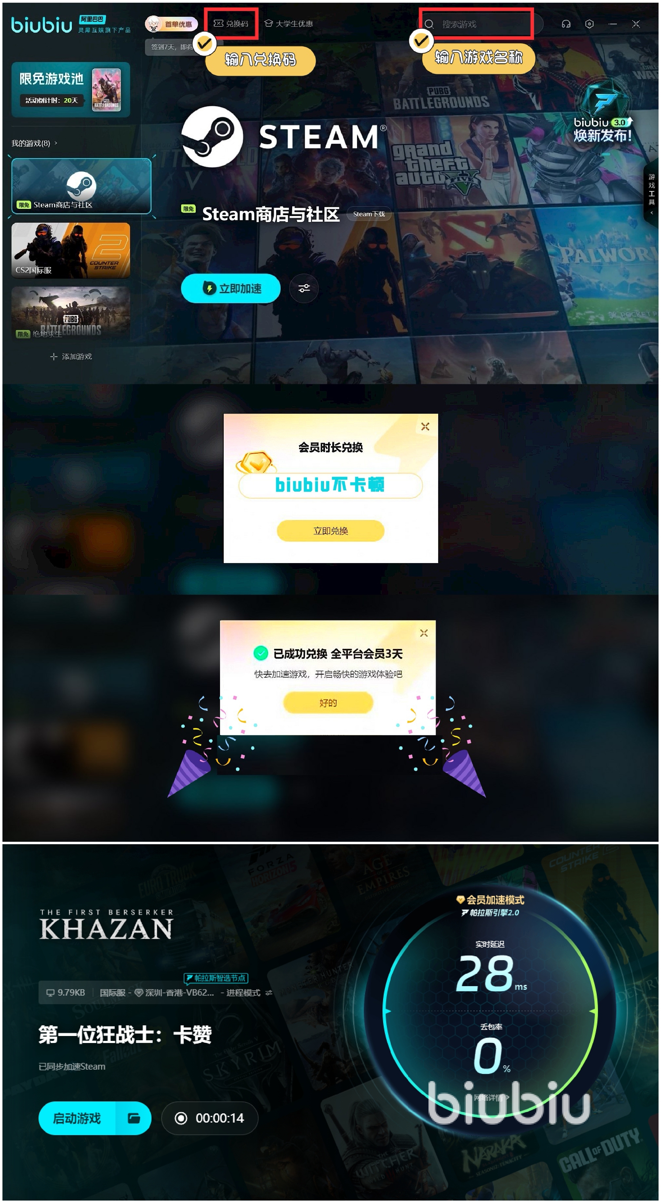 這種大型游戲?qū)Υ蠹业脑O(shè)備有一定的要求,包括網(wǎng)絡(luò)環(huán)境也需要在一個(gè)非常穩(wěn)定的環(huán)境下才能更好的操控這款游戲,即使大家網(wǎng)絡(luò)的狀態(tài)并不太好的話,也不用太擔(dān)心,只需要下載一個(gè)biubiu加速器,如果大家下載biubiu加速器,新用戶首次登錄就可以領(lǐng)取3小時(shí)的免費(fèi)加速時(shí)長(zhǎng),其次,輸入:【biubiu不卡頓】還可以領(lǐng)取三天會(huì)員。