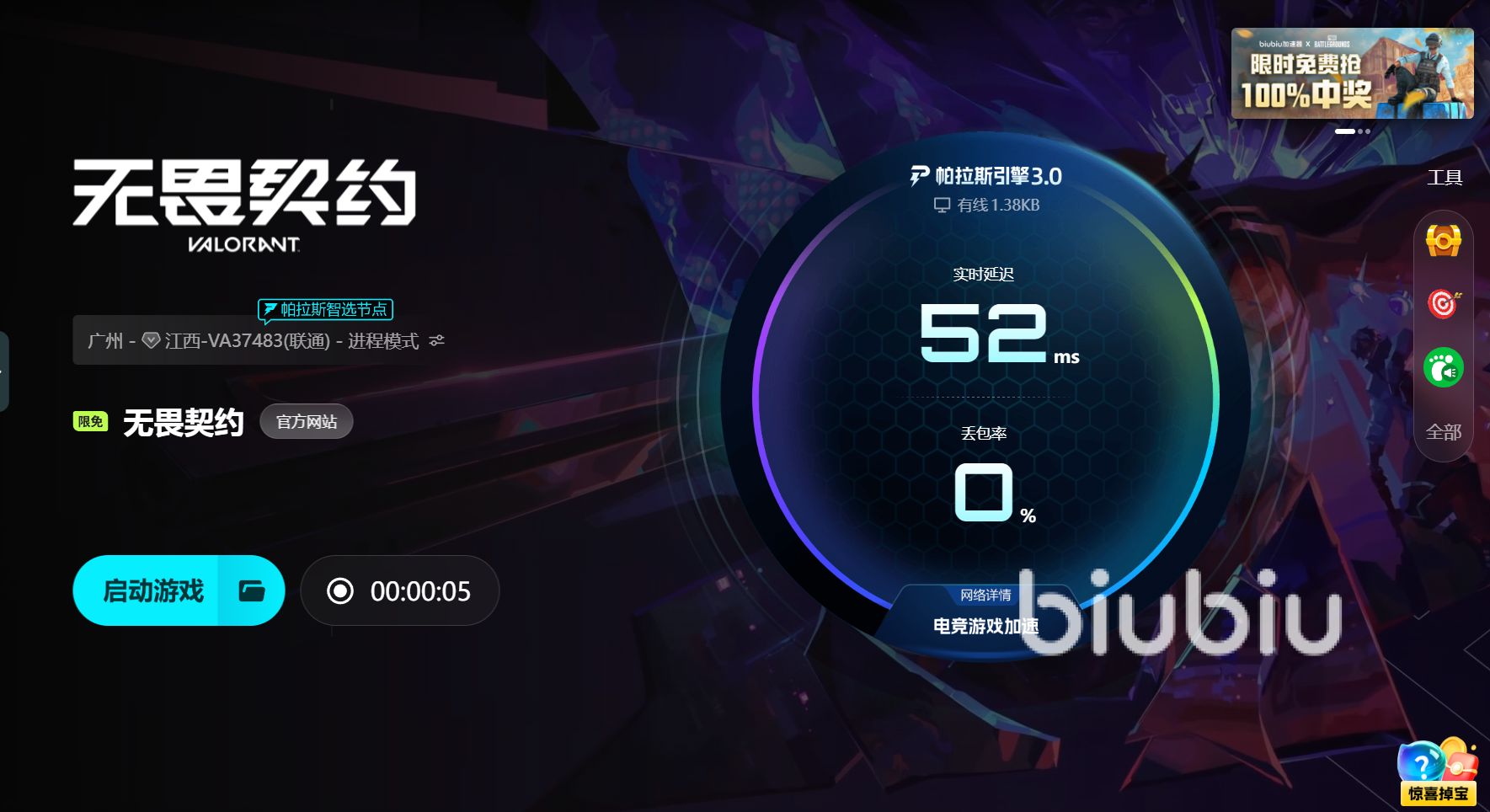 操作過程幾乎一氣呵成。啟動biubiu后,在搜索欄輸入無畏契約,選擇對應服務(wù)器,點擊加速。系統(tǒng)會自動檢測當前網(wǎng)絡(luò)狀況,為連接重新規(guī)劃最順暢的通路。整個過程安靜地在后臺完成,不需要額外設(shè)置,幾秒鐘的時間延遲就能被壓下來,重新進入游戲時能明顯感覺到畫面更穩(wěn)、技能釋放更跟手。