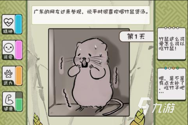 竹鼠是一個可食用的動物,自之前網(wǎng)上的一對養(yǎng)竹鼠的人視頻火了之后,就多了很多竹鼠的梗。這款手游就是讓玩家來扮演一只竹鼠,在游戲中做出的每一個選擇都決定了你會不會被吃掉。