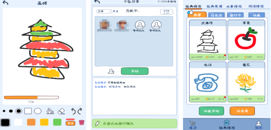 畫畫是比較鍛煉思維能力以及創(chuàng)意的一種方式,在現(xiàn)實(shí)生活中,很多孩子們也特別喜歡在不同的地方隨手一畫,而這款游戲卻支持了多人共同暢玩,沒有任何的要求,沒有任何的門檻,隨意亂花。隨意邀請(qǐng)自己的好友或者是隨機(jī)匹配,看到題目給出的具體任務(wù)之后,只有第1位玩家可以看到具體的題目,隨意起筆,而接下來的所有玩家們都要按照自己的想法完成接龍,最終畫出來的物品是否符合具體的要求。