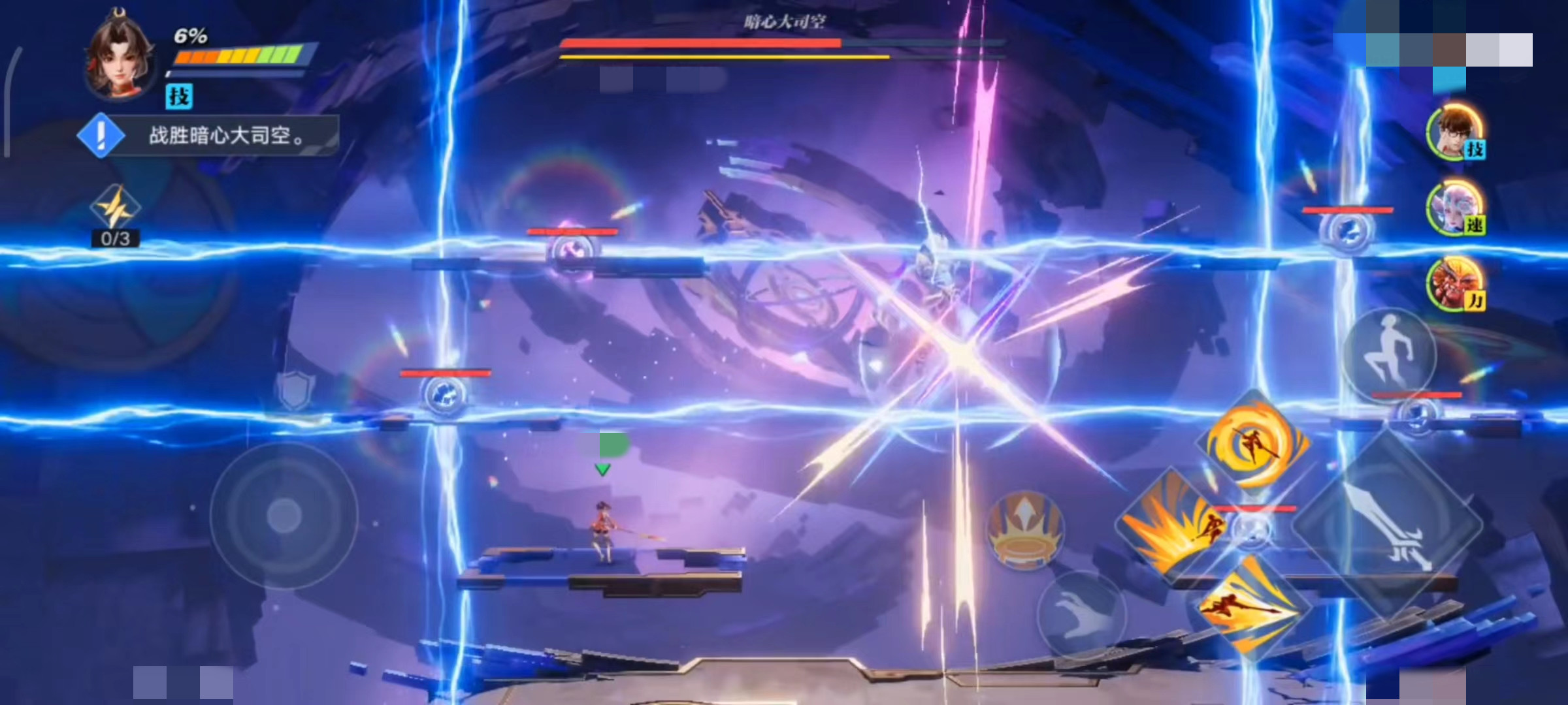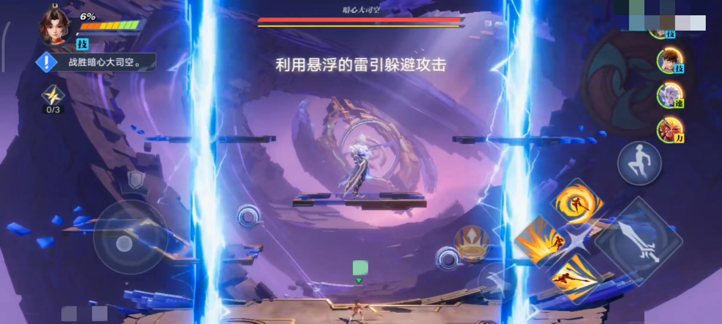 本場(chǎng)戰(zhàn)斗最大特點(diǎn)就是在任何時(shí)候都可以攻擊到司空震造成傷害,所以完全能夠利用提供的平臺(tái)進(jìn)行持續(xù)追擊。在登場(chǎng)一段時(shí)間之后,會(huì)從地圖兩側(cè)召喚天雷,天雷攻擊范圍,廣泛貫徹整個(gè)豎列,并且不斷向中間推進(jìn)。好在兩個(gè)懸浮條能夠阻擋雷電貫穿,類似于撐起的盾,從這里就可以躲避雷擊。在繼續(xù)攻擊造成一些輸出之后,會(huì)召喚出更多貫穿天雷,但是此時(shí)界面上會(huì)出現(xiàn)提示,就是那些黃色粗壯線條,這些線條就是偏雷即將出現(xiàn)的軌跡。