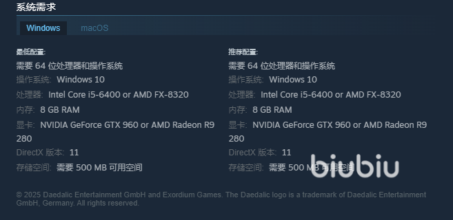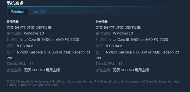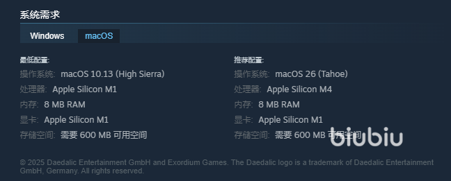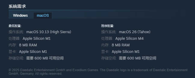 其次是mac系統(tǒng)的小伙伴,建議預(yù)留600mb的空間,顯卡M1,運(yùn)行內(nèi)存8mb。其他條件可從下圖當(dāng)中詳細(xì)查看,只要達(dá)到最低配置要求就可以順利體驗(yàn)該作品。