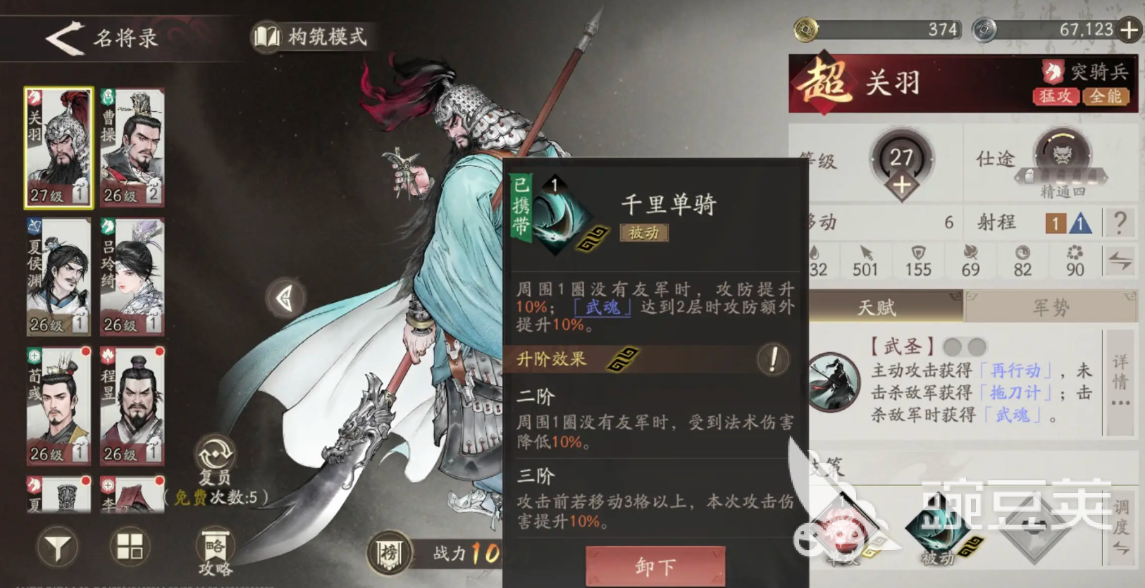 即使未完成擊殺,該技能也有概率施加“繳械”狀態(tài),使敵人無(wú)法進(jìn)行普通攻擊。進(jìn)一步升階后,若在具備2層武魂的情況下成功擊殺對(duì)手,技能冷卻將被完全清除。技能滿級(jí)后,還能根據(jù)戰(zhàn)前移動(dòng)的格數(shù),最高提升15%的傷害輸出?!皢悟T”技能則在周圍無(wú)隊(duì)友時(shí),提升自身10%的攻擊與防御,當(dāng)武魂達(dá)到2層時(shí),此增益效果翻倍。