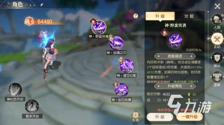 主動(dòng)技的按鍵基本上不用改動(dòng),需要注意的是升級(jí)和覺(jué)醒者兩個(gè)按鍵,技能升級(jí)的上限需要依照玩家自然等級(jí)來(lái)定,每一次升級(jí)會(huì)消耗金幣,這個(gè)金幣資源不算難獲取,而且升級(jí)會(huì)改變技能固定數(shù)值傷害以及提供的戰(zhàn)力。
