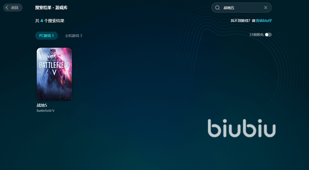可以說biubiu所能為我們提供的服務(wù)是非常多樣化的,除了戰(zhàn)地5之外,里面還涵蓋了更多熱門游戲,而且部分游戲也是可以限免加速的,除了PC游戲之外,還有更多熱門主機游戲,玩家都是可以一鍵體驗的。而且它的操作流程也是比較簡單的,就拿戰(zhàn)地5這款游戲舉例子,玩家是可以直接在biubiu內(nèi)搜索戰(zhàn)地5游戲名稱,找到相應(yīng)的游戲之后,選擇特定的區(qū)服一鍵開啟加速就可以了,操作簡單明了。