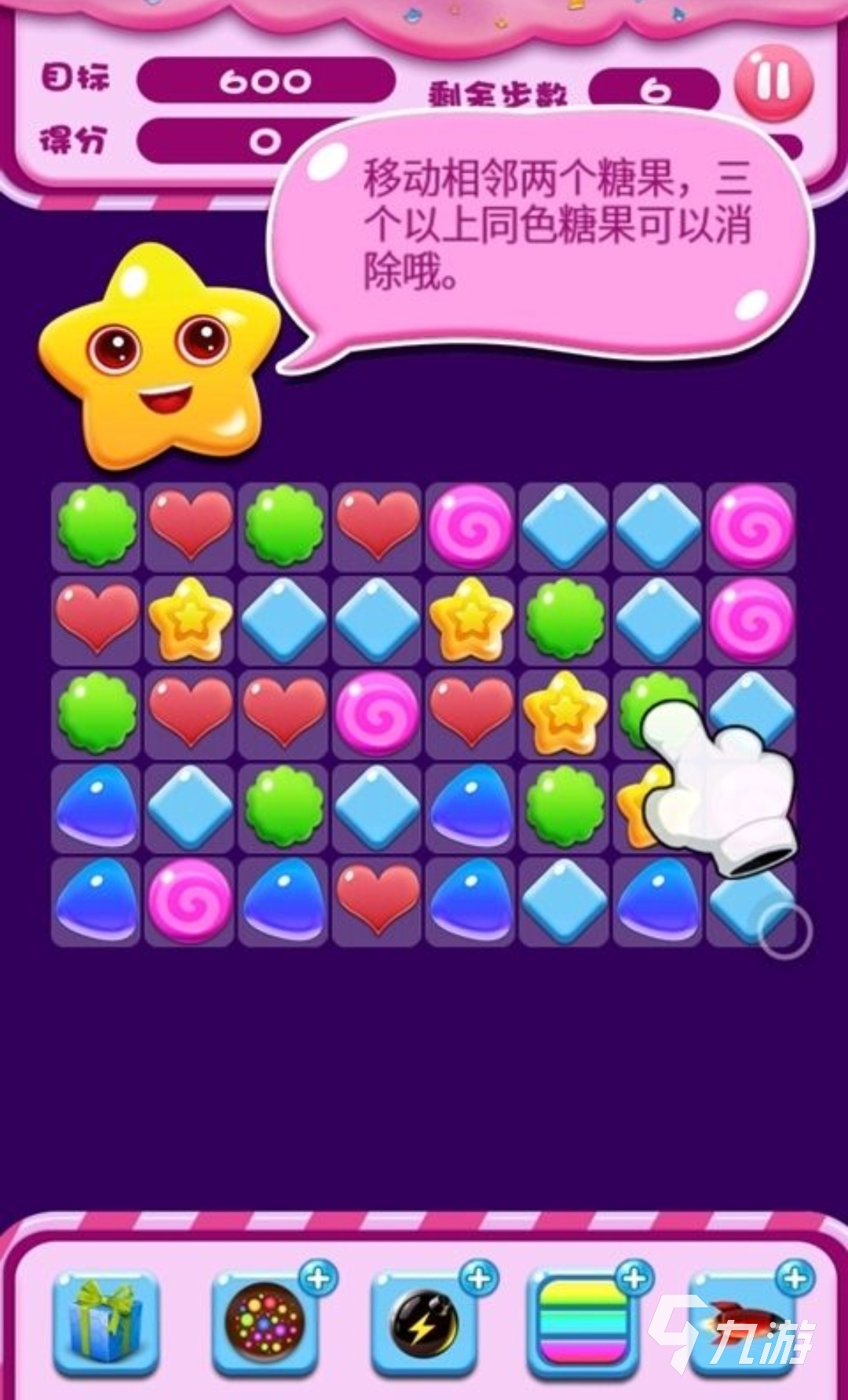 豐富多變的關(guān)卡以及可愛(ài)的糖果形象,為玩家?guī)?lái)一款有趣至極的消消樂(lè)手游,在這里,玩家每通過(guò)一關(guān)即可獲得豐厚的獎(jiǎng)勵(lì),玩家只要將兩個(gè)相鄰的糖果進(jìn)行移動(dòng),得到三個(gè)以上的同色糖果進(jìn)行消除。