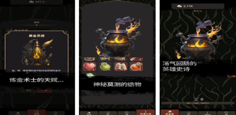 進(jìn)入到煉金術(shù)士Clicker之后,玩家會(huì)發(fā)現(xiàn)自己成為了一名煉金師,需要和其他伙伴們一起相伴探索場(chǎng)景,并且在這個(gè)過(guò)程中搜集各種可用的材料,利用材料之間的化學(xué)式合成,玩家可以獲得大量的黃金,接著可以選擇直接把這些黃金交易,這樣就能用得到的資金購(gòu)物品,幫助玩家穿梭更遙遠(yuǎn)的陸地,獲得更多的黃金資源。