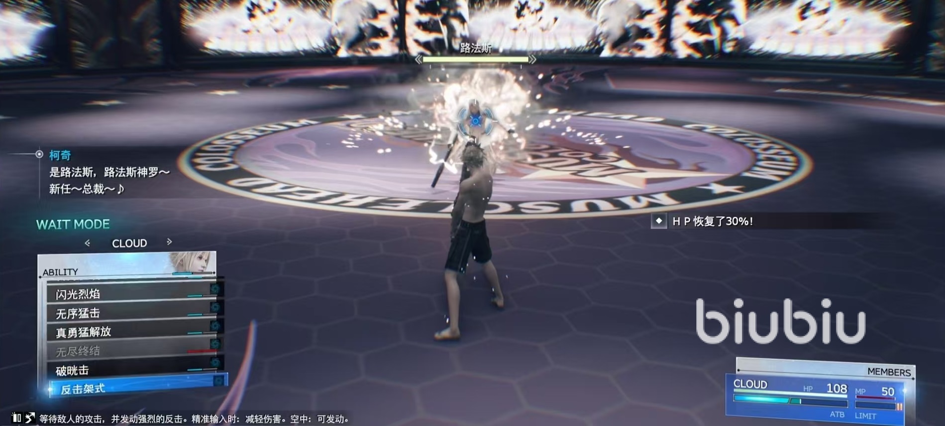 了解了機制之后,接下來就是戰(zhàn)斗的過程,進入戰(zhàn)斗后,開局看路法斯的抬手,直接使用反擊架勢,可以鎖血且續(xù)滿極限槽。通過打開菜單的子彈時間,再次觀察一下路法斯的抬手動作,路法斯發(fā)動攻擊一瞬間使用畫龍點睛,因為路法斯傷害很高,極限槽再次被蓄滿。接下來就使用完全相同的套路,再次使用畫龍點睛且極限槽蓄滿。當進入第2階段時,立即發(fā)動畫龍點睛輕松帶走。