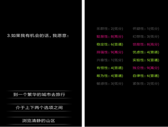 這款能進(jìn)行心理以及性格測(cè)試的,讓大家通過(guò)里面的一些測(cè)試后,更加了解自己。依托嚴(yán)謹(jǐn)?shù)臄?shù)據(jù),甚至是專(zhuān)業(yè)的算法,如果想通過(guò)這種游戲來(lái)判斷一下自己的心理,就能根據(jù)各種測(cè)試的題目做一個(gè)簡(jiǎn)單的了解,有各種各樣的可能。在玩的時(shí)候,由于里面的測(cè)試題目特別的多,所以一定要耐心的閱讀,然后選擇正確的選項(xiàng)。