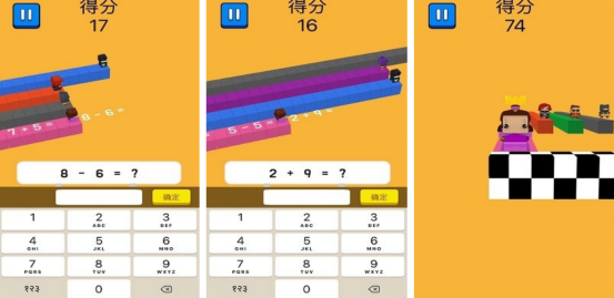 各種口算組合而成,在每個關(guān)卡開始后都會看到不同的題目,比如8-6=幾,而下方會有相應(yīng)的數(shù)字,你只要從中選擇到正確的答案,點(diǎn)擊確定即可讓其中的小人物逐漸向前沖。將跑酷以及口算的玩法巧妙結(jié)合,形成了極高的挑戰(zhàn)性。小人物前進(jìn)的距離和自己答對的題目有很大的關(guān)系,看看你的準(zhǔn)確率到底有多高。