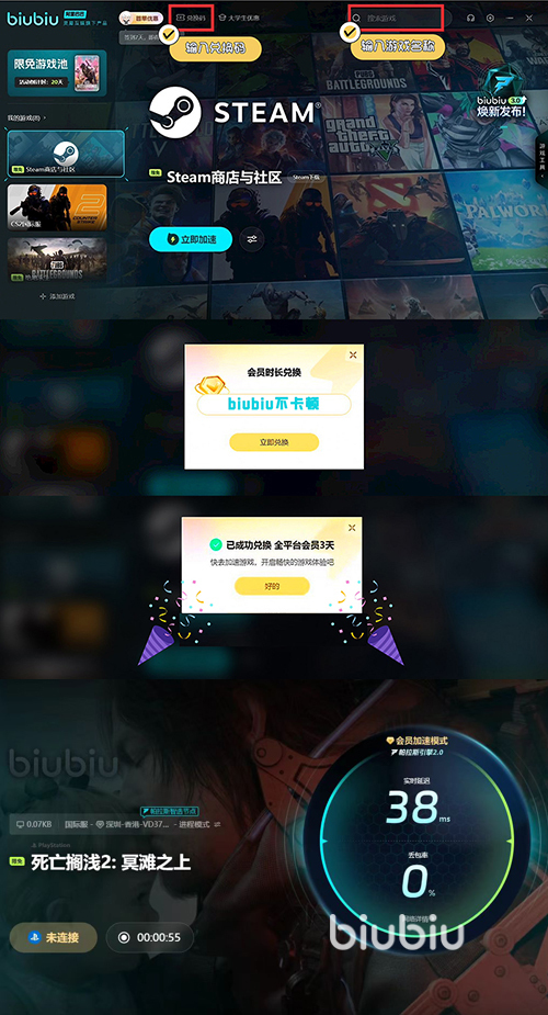 死亡擱淺2武器庫(kù)豐富,玩家選擇合適武器,打出出其不意的攻擊。biubiu軟件為游戲加速效果好,它還能免費(fèi)試用,新用戶擁有免費(fèi)24小時(shí)特權(quán),還有兌換碼【biubiu不卡頓】免費(fèi)加速3天福利。