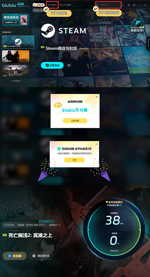 死亡擱淺2上線(xiàn)期間獎(jiǎng)勵(lì)多多,玩家使用biubiu加速器,游戲流暢不卡頓。新玩家自動(dòng)領(lǐng)取24小時(shí)加速時(shí)長(zhǎng),還能采用【biubiu不卡頓】?jī)稉Q碼獲得3天加速時(shí)間。