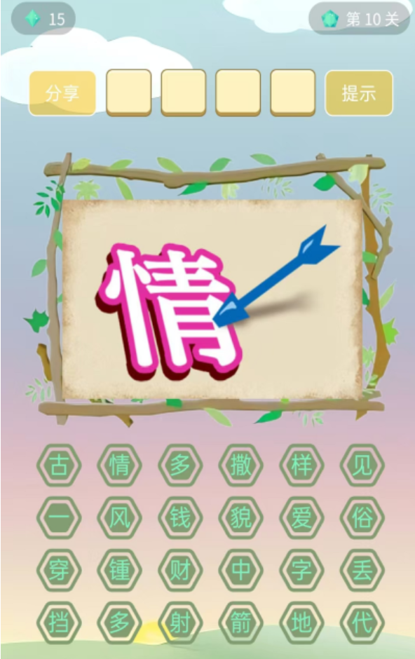 作為一款看圖猜成語(yǔ)類游戲,它的難度不高,游戲界面也會(huì)涉及到畫面的提示。玩家在體驗(yàn)游戲的時(shí)候需要通過(guò)闖關(guān)來(lái)獲得較多的樂(lè)趣,不過(guò)每一個(gè)關(guān)卡下面還會(huì)有對(duì)應(yīng)的字體提示,玩家只需要根據(jù)這些文字篩選出符合的成語(yǔ),也就可以算闖關(guān)成功。其實(shí)在闖關(guān)的時(shí)候只需要找到一個(gè)成語(yǔ),就代表玩家這時(shí)候過(guò)關(guān)。不過(guò)整個(gè)游戲的風(fēng)格是具備特色的,因?yàn)楣棚L(fēng)卡通的游戲畫面是很多玩家所喜歡的。