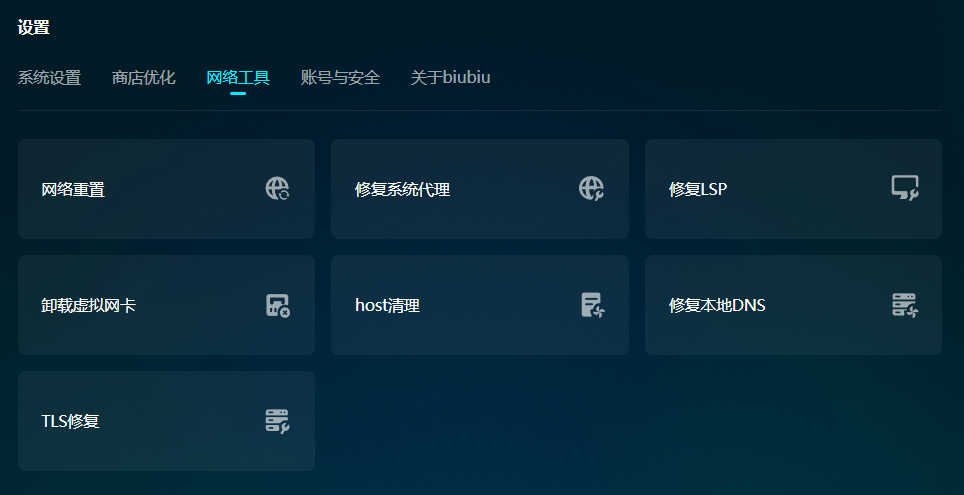 biubiu的工具箱也是一個很好用的功能,當(dāng)網(wǎng)頁無法加載,或者無法進(jìn)入游戲,都先用工具修復(fù)它們。系統(tǒng)修復(fù)也是免費的,電腦里安裝biubiu就等于安裝了一個全能的游戲助手,不管是加速還是解決故障都能輕松搞定。