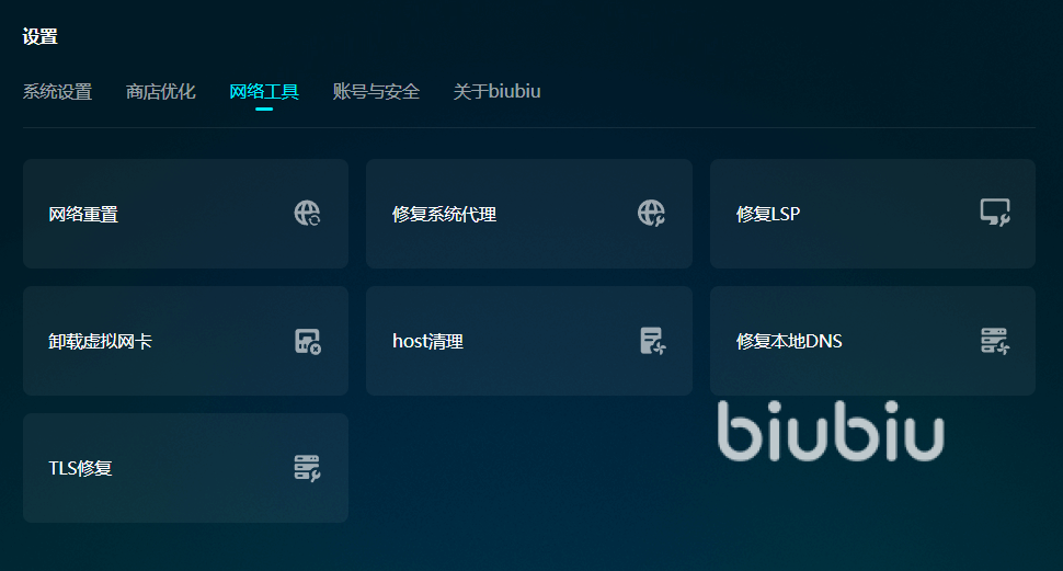 并且大家還能通過biubiu的工具箱來優(yōu)化電腦環(huán)境,工具箱里的7個工具對應(yīng)解決的是7個大類的電腦故障,不僅能一鍵來清理緩存,還能修復系統(tǒng)代理,重新配置好網(wǎng)卡讓游戲加速不再失敗。電腦環(huán)境優(yōu)化好以后軟件加速起來也很順暢,玩游戲當然快樂多了。
