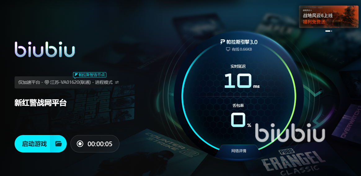 總體來說,游戲平臺(tái)的作用,是把對(duì)戰(zhàn)雙方的游戲操作數(shù)據(jù),通過平臺(tái)內(nèi)的程序進(jìn)行交換,讓游戲達(dá)到局域網(wǎng)的結(jié)果,無(wú)論是服務(wù)器網(wǎng)絡(luò)或者本地網(wǎng)絡(luò)發(fā)生異常,都會(huì)阻斷這些數(shù)據(jù)傳輸,所以,實(shí)際上解決數(shù)據(jù)傳輸問題,就能解決游戲閃退的問題,對(duì)于這個(gè)問題,可通過游戲加速器給對(duì)戰(zhàn)平臺(tái)進(jìn)行加速,提高傳輸效率,推薦大家使用核心功能剛強(qiáng)勢(shì)升級(jí)的biubiu加速器。