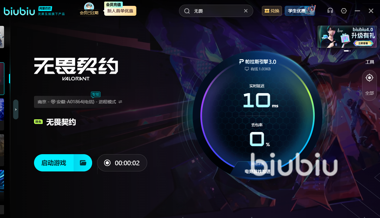 通過biubiu加速器對(duì)游戲網(wǎng)絡(luò)的提速,讓游戲可以在穩(wěn)定、持久的網(wǎng)絡(luò)環(huán)境中運(yùn)行,也就讓大家徹底不需要再被“無畏契約閃退修復(fù)游戲怎么辦”所煩惱,另外需要指出的是,作為一款專門為游戲開發(fā)的輔助加速軟件,biubiu所能處理的不僅僅是閃退,大家日常所遇到的常見網(wǎng)絡(luò)問題,比如卡頓、延遲等,biubiu都可以輕易解決,還大家一個(gè)流暢的游戲體驗(yàn)。