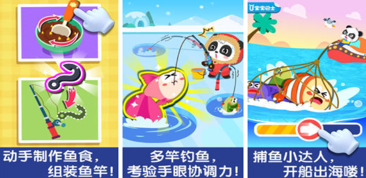 寶寶釣魚手游能體驗不同場景的釣魚玩法,首先要準備釣魚的工具,拌好魚餌、裝好魚竿,可以在冰面上鑿洞釣魚,有時候要同時用好幾根魚竿,也能潛到海底用魚叉捕魚,捕魚的時候要躲開大的魚類,每釣到一條魚都會提示魚的名字,能認識不同的魚。