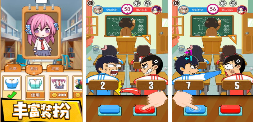 同桌大作戰(zhàn)是款趣味性很強(qiáng)的雙人分屏對(duì)抗類游戲,搞笑的畫風(fēng)和清新的美術(shù)風(fēng)格讓人眼前一亮,兩個(gè)玩家分別控制兩個(gè)中學(xué)生進(jìn)行戰(zhàn)斗,在比拼手速的同時(shí)也要觀察老師的視線。課堂的背景加上各種各樣的校服很有年代感,讓玩家感覺回到了自己的學(xué)生時(shí)期,鮮艷的色彩渲染搭配魔性十足的玩法讓人欲罷不能,快下載這款分屏游戲鍛煉一下自己的眼力和手速吧。
