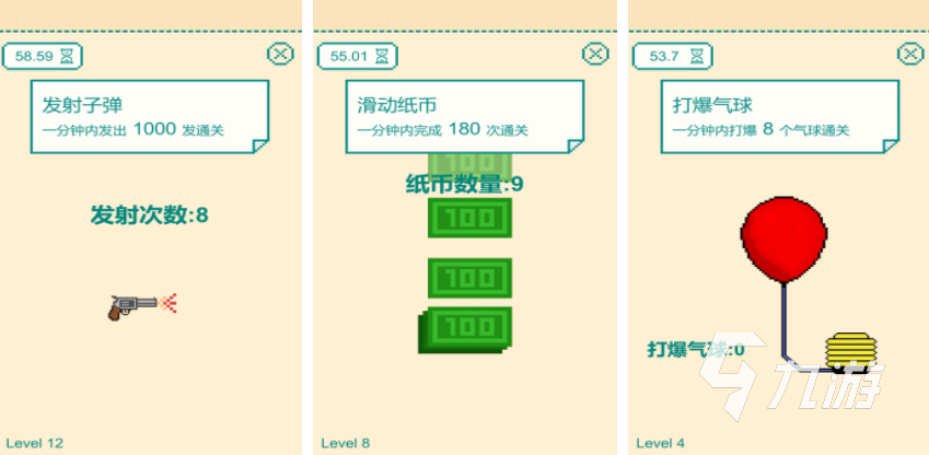 很多人想要通過(guò)游戲來(lái)放松自己,這時(shí)候就可以嘗試1分鐘手速挑戰(zhàn),里面會(huì)設(shè)定大量的關(guān)卡,每一關(guān)都會(huì)以1分鐘為時(shí)間限制,需要在1分鐘的時(shí)間內(nèi)盡可能多的發(fā)射子彈,或者通過(guò)點(diǎn)擊的方式關(guān)閉場(chǎng)景上出現(xiàn)的電腦彈窗,另外還可以在游戲里不斷給氣球打氣,這些游戲的操作都比較簡(jiǎn)單,終極目的都是為了讓玩家能通過(guò)游戲釋放自己的壓力,趕快在這1分鐘之內(nèi)讓自己完成更多項(xiàng)不同的挑戰(zhàn)吧。