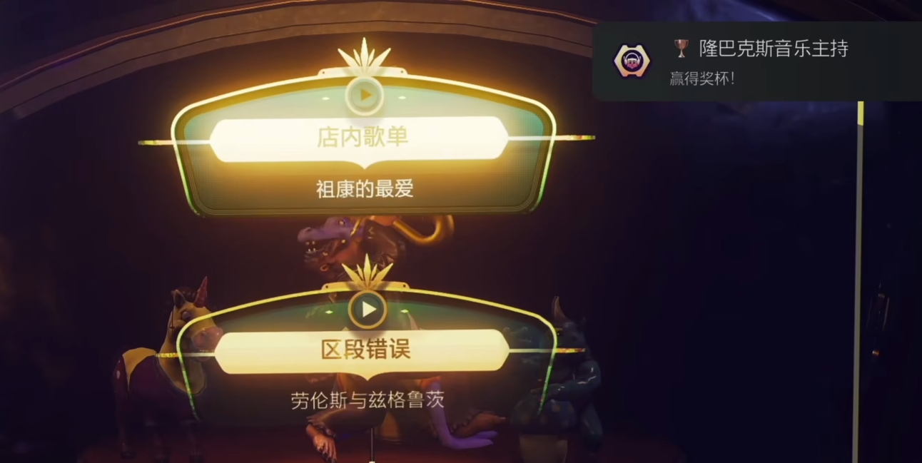 該獎(jiǎng)杯的任務(wù)流程地點(diǎn)同樣是剛才我們的祖奇小鋪,需要在競(jìng)技場(chǎng)臺(tái)的左側(cè),也就是在吧臺(tái)旁邊可以找到一臺(tái)點(diǎn)唱機(jī),在這里可以來(lái)點(diǎn)唱切換音樂(lè)。要完成該獎(jiǎng)杯的話,我們只需要隨便播放三首截然不同的音樂(lè),即可獲得該獎(jiǎng)杯。