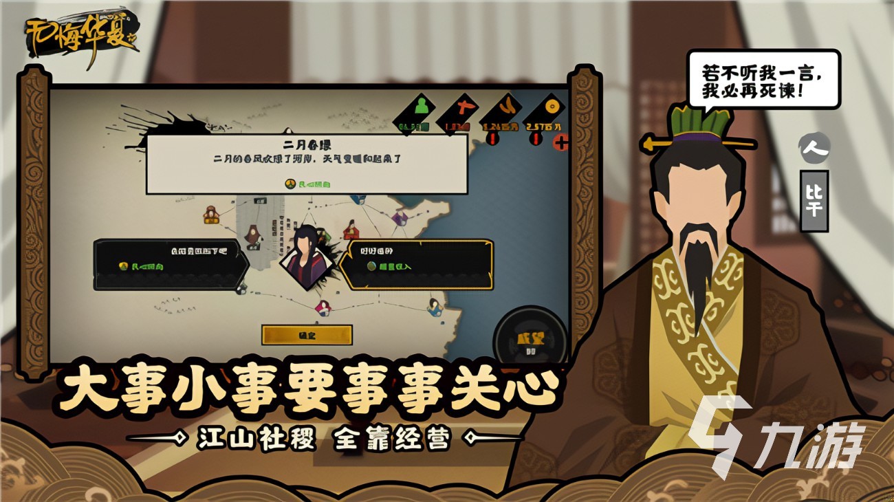《無(wú)悔華夏》是一款多個(gè)朝代的歷史題材的模擬經(jīng)營(yíng)手游,你將扮演所選擇的勢(shì)力的君主,帶領(lǐng)一眾名臣武將,發(fā)動(dòng)自己的聰明智慧,制定策略學(xué)習(xí)不同的政策來(lái)發(fā)展壯大自己的勢(shì)力,游戲中還加入了大量的隨機(jī)事件,你在這些隨機(jī)時(shí)間的選擇將會(huì)直接作用到推動(dòng)你勢(shì)力的發(fā)展
