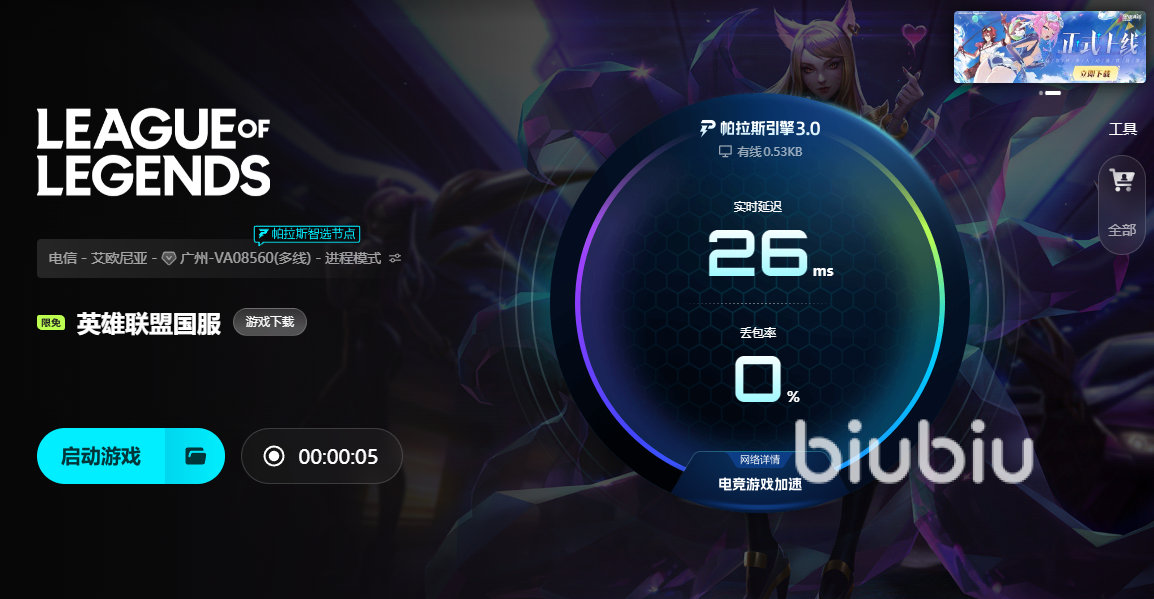 由于游戲本身是需要玩家有個(gè)穩(wěn)定網(wǎng)絡(luò)加持的,如果用戶到時(shí)遇到了延遲很高,或者是頻繁掉幀等問(wèn)題就很頭疼,英雄的戰(zhàn)斗操作上也不夠流暢,那么此時(shí)去打開(kāi)biubiu來(lái)幫自己就很重要了,它強(qiáng)大的專線加速能力,能讓玩家長(zhǎng)時(shí)間游戲期間也足夠的穩(wěn)定。
