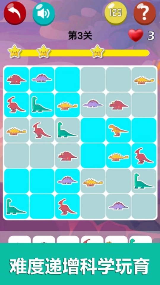 此作是面向兒童的數獨作品,它通過使用不同造型的恐龍來完成對數字的替代,令其在畫面上更有卡通感,方便孩子們去接受。而且其六宮數獨的玩法與其它的數獨作品沒有任何的差別,只要橫、列、各方塊區(qū)域內的格子都由不同的恐龍構成,那么在填滿數獨盤上的所有格子后,就會被視為挑戰(zhàn)成功。游戲有著多道樣式不重復的關卡,且這些關卡只要解鎖后都能免費游玩,無需任何的成本。