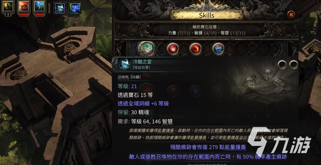 然后最后再加一個護盾的冷酷之宴,這是可以在持續(xù)召喚物的時候撿起能量護盾,這里不需要加額外輔助石。