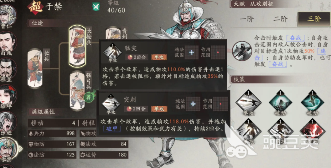 于禁在游戲當(dāng)中的定位是一個(gè)遠(yuǎn)程騎兵,其三階段的“奮戰(zhàn)“效果,可以無視目標(biāo)75%的防御,同時(shí)在合擊技能觸發(fā)時(shí),自身對敵方目標(biāo)會(huì)再次造成一次,基于自身物理攻擊倍率50%的連擊效果,協(xié)助隊(duì)友的同時(shí),于禁也可以觸發(fā)奮戰(zhàn)狀態(tài)。