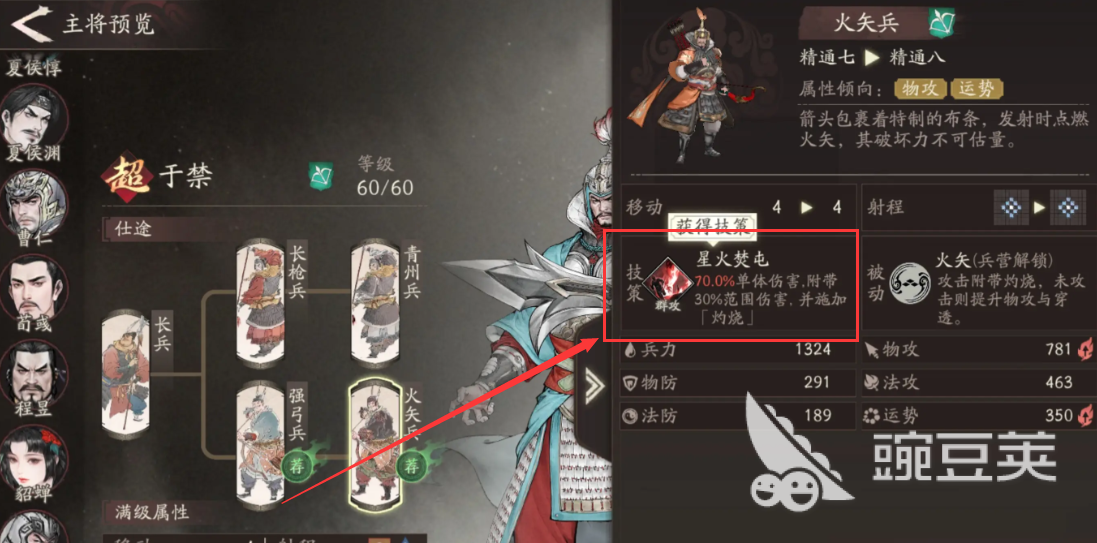 于禁大招效果“星火焚屯”,冷卻時(shí)間兩個(gè)回合,屬于群攻技,可以攻擊單個(gè)的敵方目標(biāo),同時(shí)造成物理攻擊70%的傷害,隨后傷害會(huì)擴(kuò)散,對周圍十字目標(biāo)的所有敵方軍隊(duì),造成基于自身物理攻擊30%的傷害。