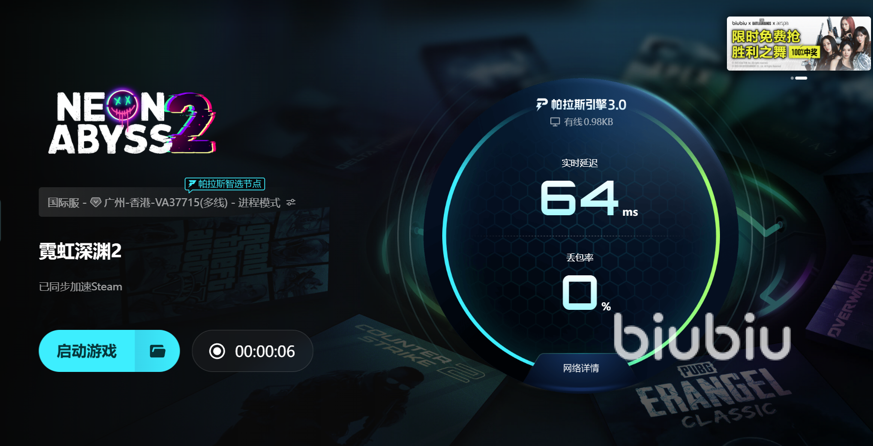 值得一提的是,biubiu加速器近期引入了帕拉斯引擎3.0,這項重磅技術升級是與知名冠軍選手Aixleft聯(lián)合調(diào)校的結果,使加速效率和穩(wěn)定性都達到了新高度。帕拉斯引擎的加入讓biubiu在處理復雜網(wǎng)絡環(huán)境時表現(xiàn)更加智能,能夠自動識別最優(yōu)傳輸線路并動態(tài)調(diào)整策略,大幅提升了用戶在不同網(wǎng)絡條件下的加速體驗。對于玩家來說,這意味著不僅《霓虹深淵2》的下載速度更快了,后續(xù)游玩時的連接質(zhì)量也更加可靠。玩家不用再擔心因為網(wǎng)絡問題而錯過游戲精彩內(nèi)容或團隊合作關鍵時刻。