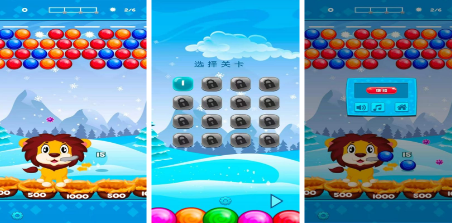 幸運(yùn)六獅是一個(gè)體驗(yàn)起來比較輕松的游戲,里面主打的不是模擬獅子捕獵,而是需要操控獅子在游戲里完成消除挑戰(zhàn),挑戰(zhàn)開始之后,場(chǎng)景的上方會(huì)有很多彩色的泡泡,下方會(huì)有一只獅子,每隔一段時(shí)間獅子都會(huì)吐出對(duì)應(yīng)的泡泡,要通過滑動(dòng)的方式控制這些泡泡的軌跡,讓他們?cè)谏罩笥|碰到顏色相同的泡泡,每一關(guān)這些泡泡的排列順序都會(huì)有所變化,玩家需要根據(jù)實(shí)際的情況,通過滑動(dòng)調(diào)整這些泡泡的方向。