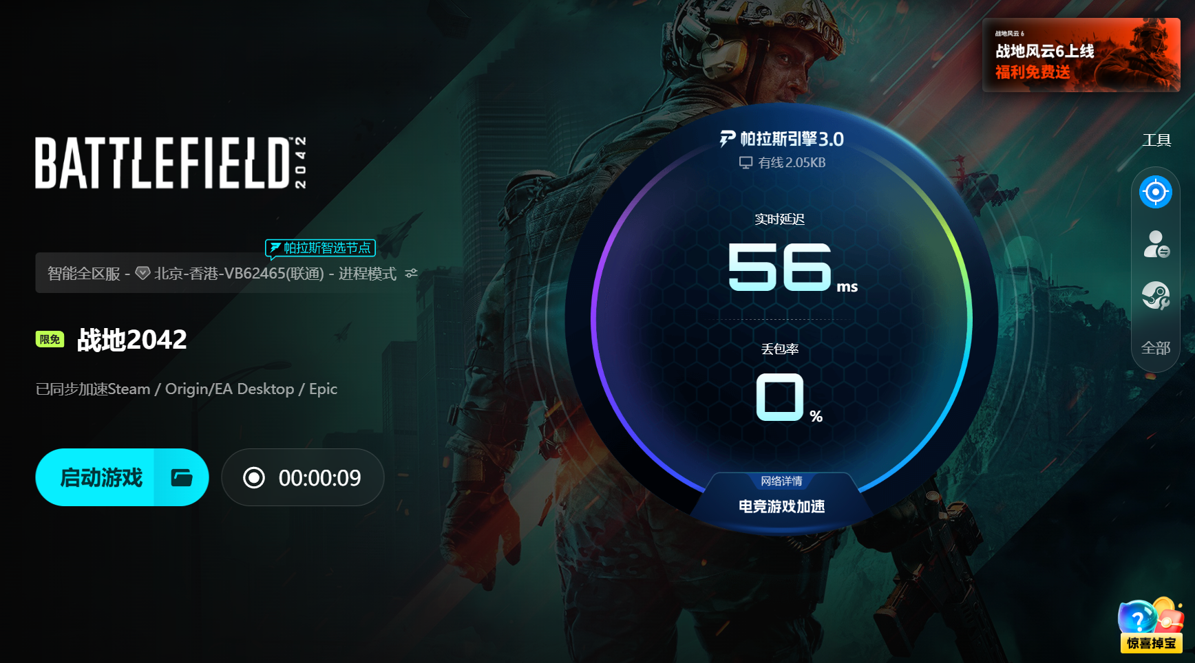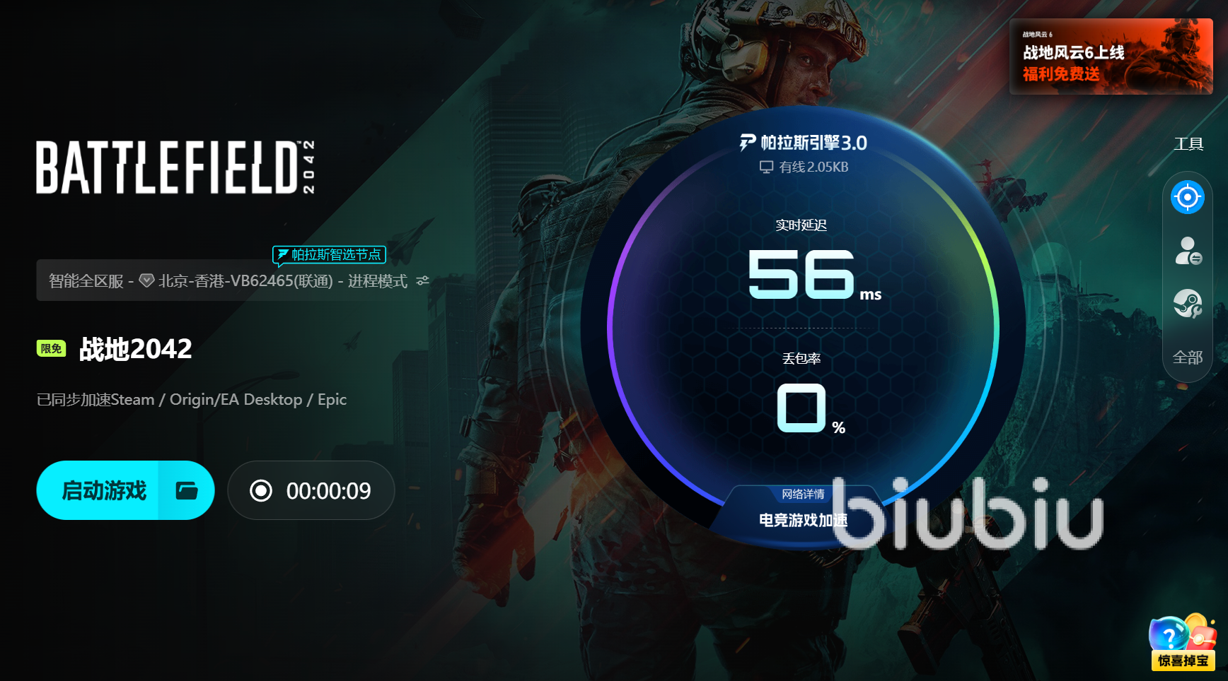 操作方式非常簡單。打開biubiu客戶端,選擇戰(zhàn)地2042并點擊開啟。系統(tǒng)會自動識別并連接到最佳節(jié)點,無需手動配置。后臺運行輕量,不占用系統(tǒng)資源,也不會拖慢幀率。幾秒鐘內(nèi)網(wǎng)絡便能打通,重新啟動游戲時即可快速登錄,告別卡在加載界面的等待。加載條流暢推進,伴隨熟悉的音樂聲,游戲體驗立刻恢復順暢。