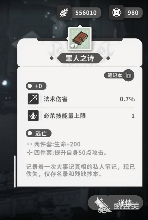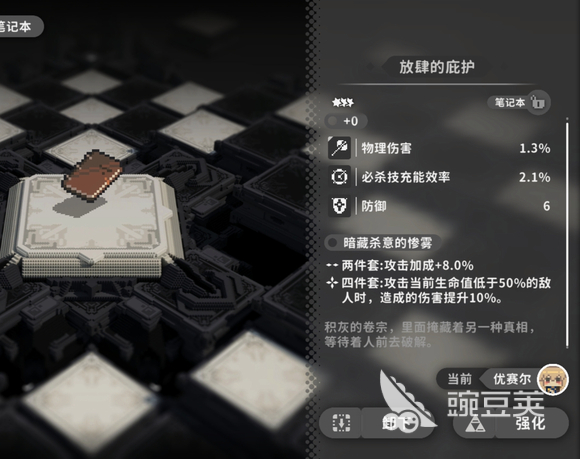 暗藏殺意的慘霧這套界牌是一套能夠增加玩家物理攻擊以及必殺技能充效率的裝備,玩家若是裝備上該套種的2件物品,攻擊加成可以提高8%,穿戴4件套的話,當(dāng)玩家去攻擊生命值不足50%的敵人時,給敵人造成的傷害將會提升10%,大家在收集該套物品時,建議大家優(yōu)先去收集筆記本放肆的庇護(hù)、書簽行兇的預(yù)告、懷表未眠的等待等物品,這些物品在裝備上以后,角色自身的物理傷害都將會得到顯著的提升。
