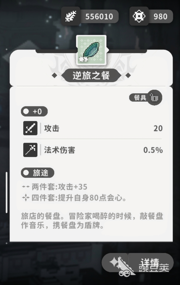 旅途套包含了逆旅之餐、舊鄉(xiāng)之音、漫游之記、風(fēng)雨之信、遠(yuǎn)行之心、懷人之贈等物品,這套裝備就如其名字一樣非常,每個物品雖然都有著極為詩意的名字,可是裝備自身的能力也是絕對不弱,比如說逆旅之餐,這個物品裝備上以后能夠增加20點(diǎn)的餓法術(shù)攻擊,法傷傷害也會提升0.5%,若是裝備上兩件該套裝物品的話,那自身的攻擊力就能增加35點(diǎn),穿戴兩件,還能提高80點(diǎn)的會心。